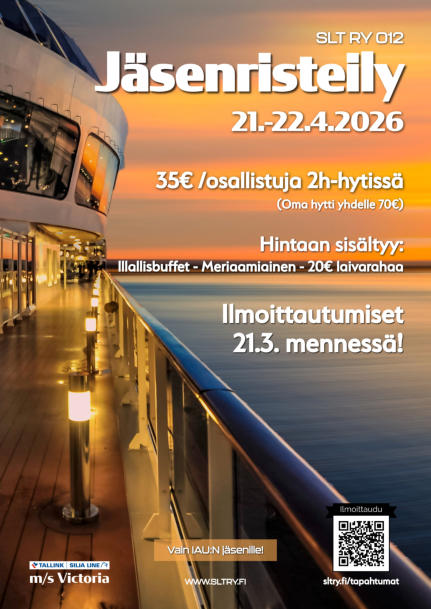 16.1.2026Jäsenristeily 21.04.2026SLT ry:n jäsenristeily 21.4.2026.Laita vapaatoiveet vetämään ja ilmoittaudu mukaan.Aikataulut ja ohjelmaTiistai 21.4.•Satamassa kokoonnutaan 16:45•Illallisbuffet alkaa klo. 18:00.•Laiva lähtee klo. 18:35.Keskiviikko 22.4.•Meriaamiainen klo. 07:00-10:00.•Laiva saapuu satamaan klo. 16:00Huomioitavaa!Ota valmiiksi käsille osallistujien IAU-jäsennumerot ennen kuin siirryt täyttämään tietoja. Ilmoittautuminen edellyttää voimassa olevaa jäsenyyttä. Jos et tiedä jäsennumeroasi, ota yhteyttä työpaikkasi edunvalvojiin jäsennumeron selvittämiseksi.